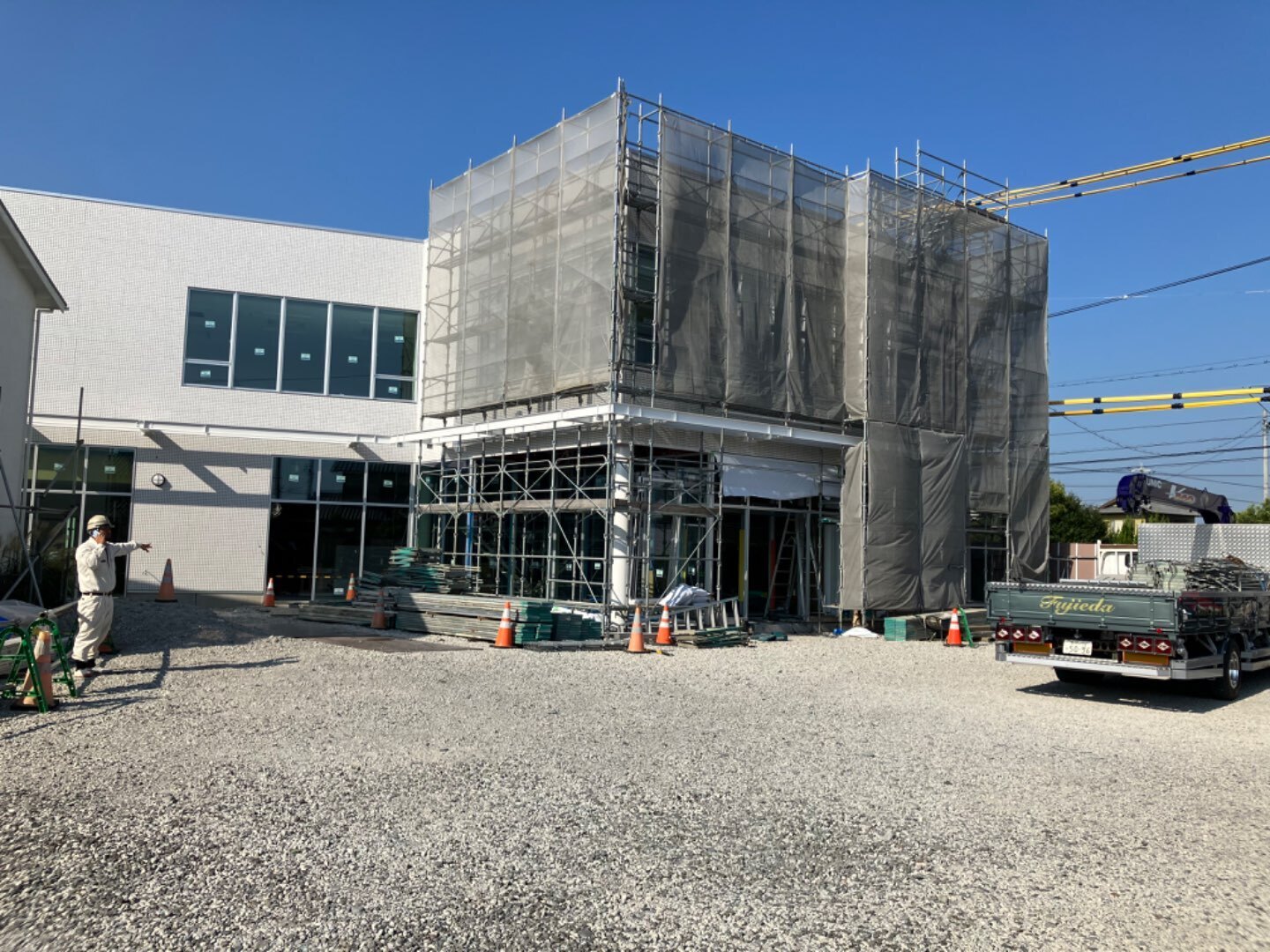 某信用金庫新築工事です。建物の周りの外部足場解体が始まりました。今までシートに囲われていて見えなかった綺麗な外観をお披露目出来る嬉しい瞬間です。